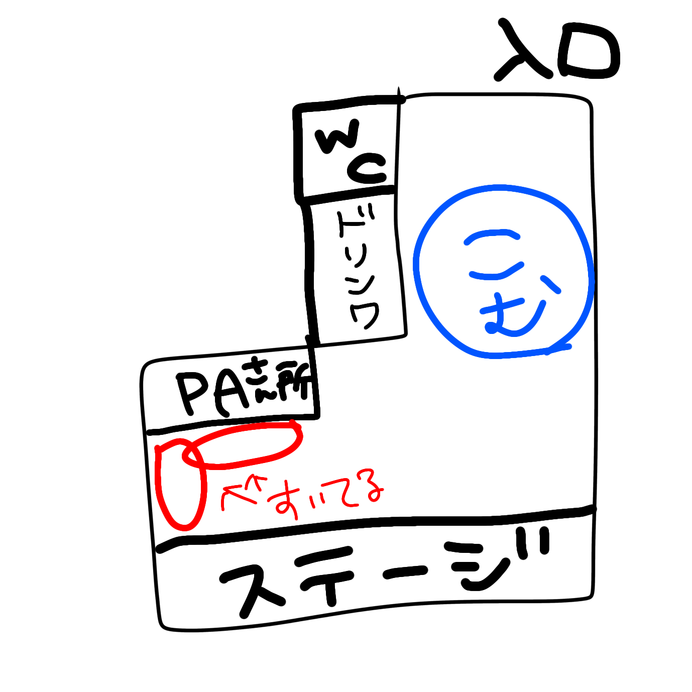 今回はみんな大変かもしれんけどパンパンッのパンパンッのパンになるフロア目指してます!もちろん私も前詰めてくださいってアナウンスは沢山するんやけど、フロアの構造的にここの青いところに人が集中して、赤いところスカスカってなりがち!