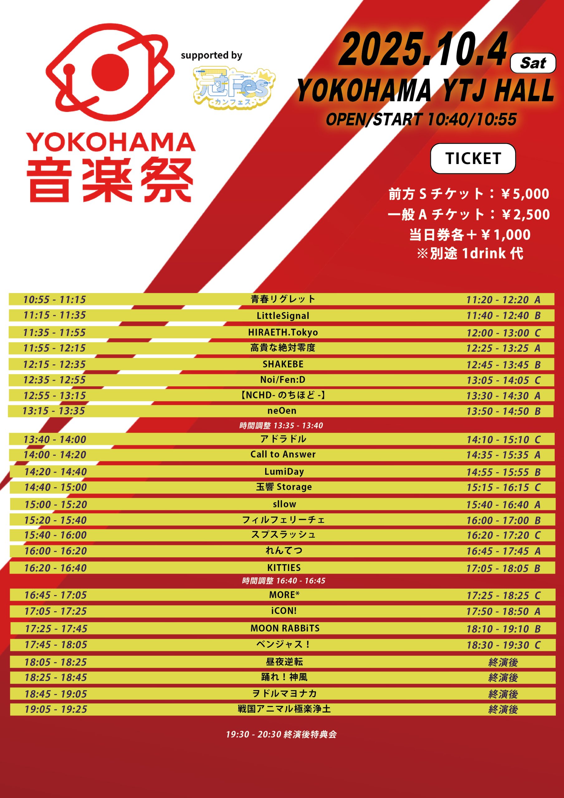 出演者 ベンジャス!/昼夜逆転/踊れ!神風/フィルフェリーチェ/青春リグレット/玉響Storage/MORE*/sllow/SHAKEBE/LumiDay/LittleSignal/HIRAETH.Tokyo/iCON!/【NCHD-のちほど-】/れんてつ/neOen/MOON RABBiTS/アドラドル/KITTIES/戦国アニマル極楽浄土/ヲドルマヨナカ/高貴な絶対零度/Call to Answer/Noi/Fen:D/スプスラッシュ