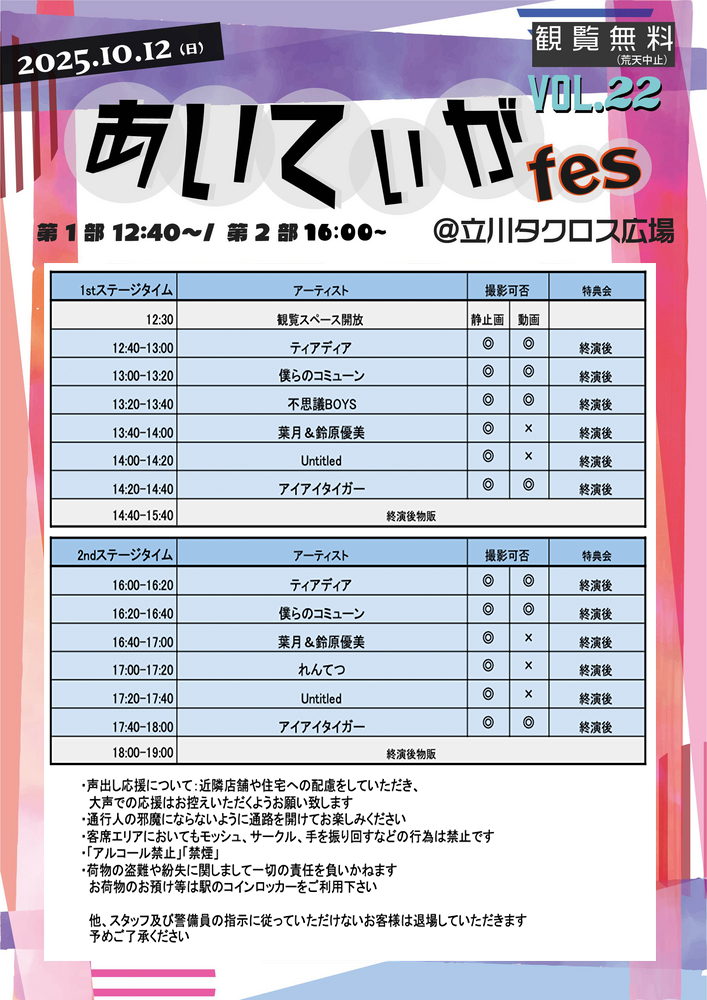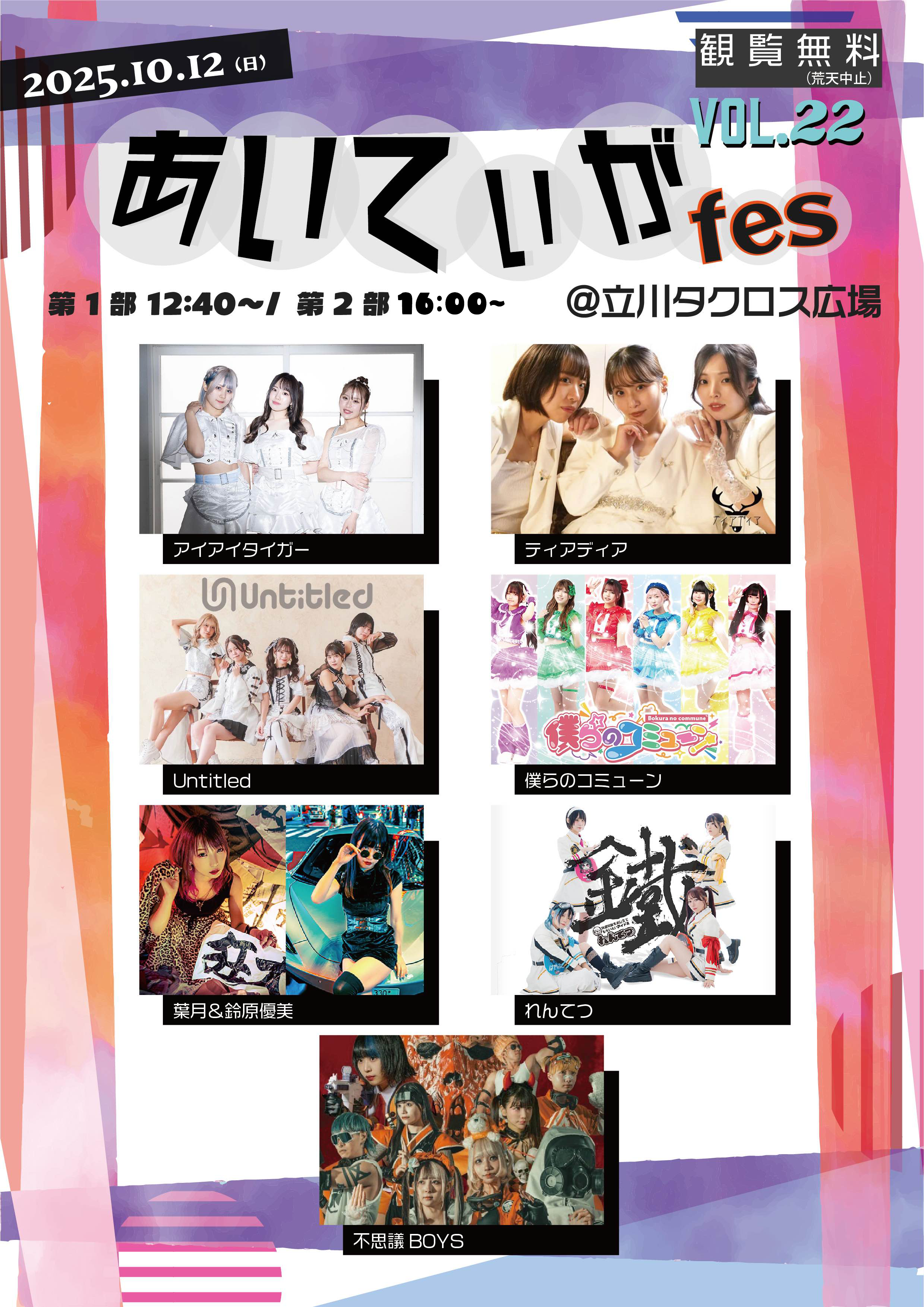 日程 2025年10月12日(日) あいてぃがFes. vol.22@立川タクロス広場 2部 観覧無料 昼夕2部構成 荒天中止 会場 立川タクロス広場 時間 2部 OPEN/START16:00〜 出演時間 17:00-17:20 物販時間 18:00-19:00 料金 観覧無料 ※予約は不要です