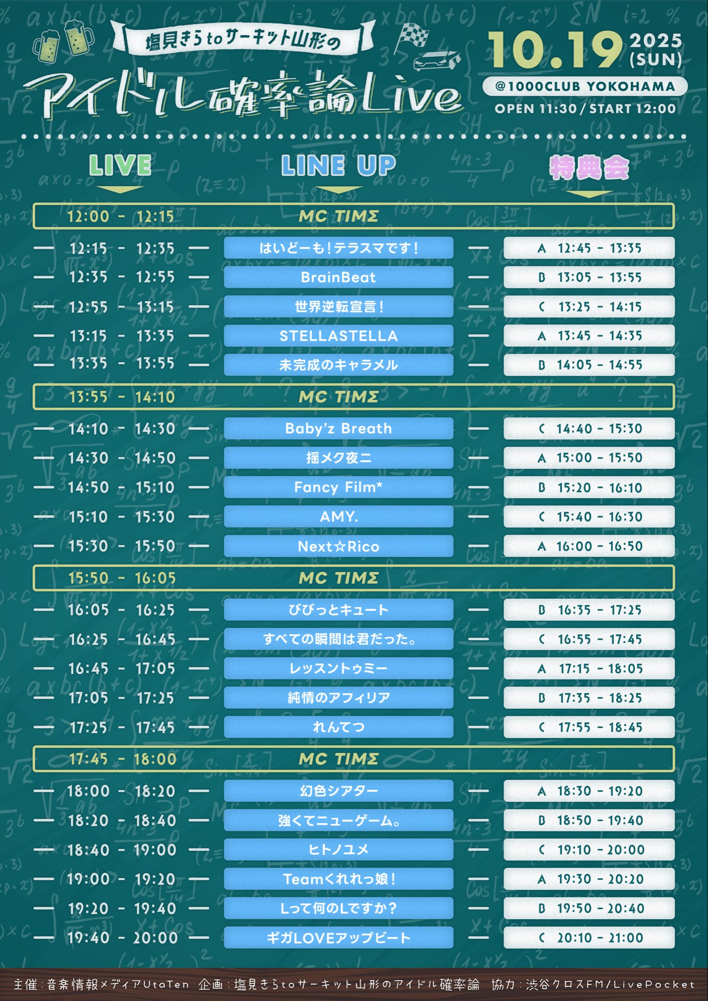 出演者 純情のアフィリア/Teamくれれっ娘!/強くてニューゲーム。/幻色シアター/れんてつ/Next☆Rico/揺メク夜ニ/びびっとキュート/レッスントゥミー/ギガLOVEアップビート/Lって何のLですか?/未完成のキャラメル/ヒトノユメ/Fancy Film*/Baby’z Breath/AMY. /STELLASTELLA/BrainBeat/世界逆転宣言!/すべての瞬間は君だった。/はいどーも!テラスマです!/(※順不同)