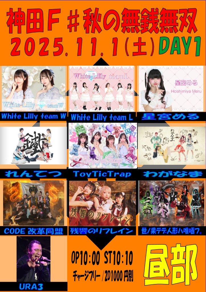 日程 2025年11月1日(土) 神田F#秋の無銭無双 昼部 会場 神田F# 時間 OPEN10:00 / START10:10 出演時間 公開までお待ちください 物販時間 公開までお待ちください 料金 0/0(2D¥1,000) ※予約は不要です。