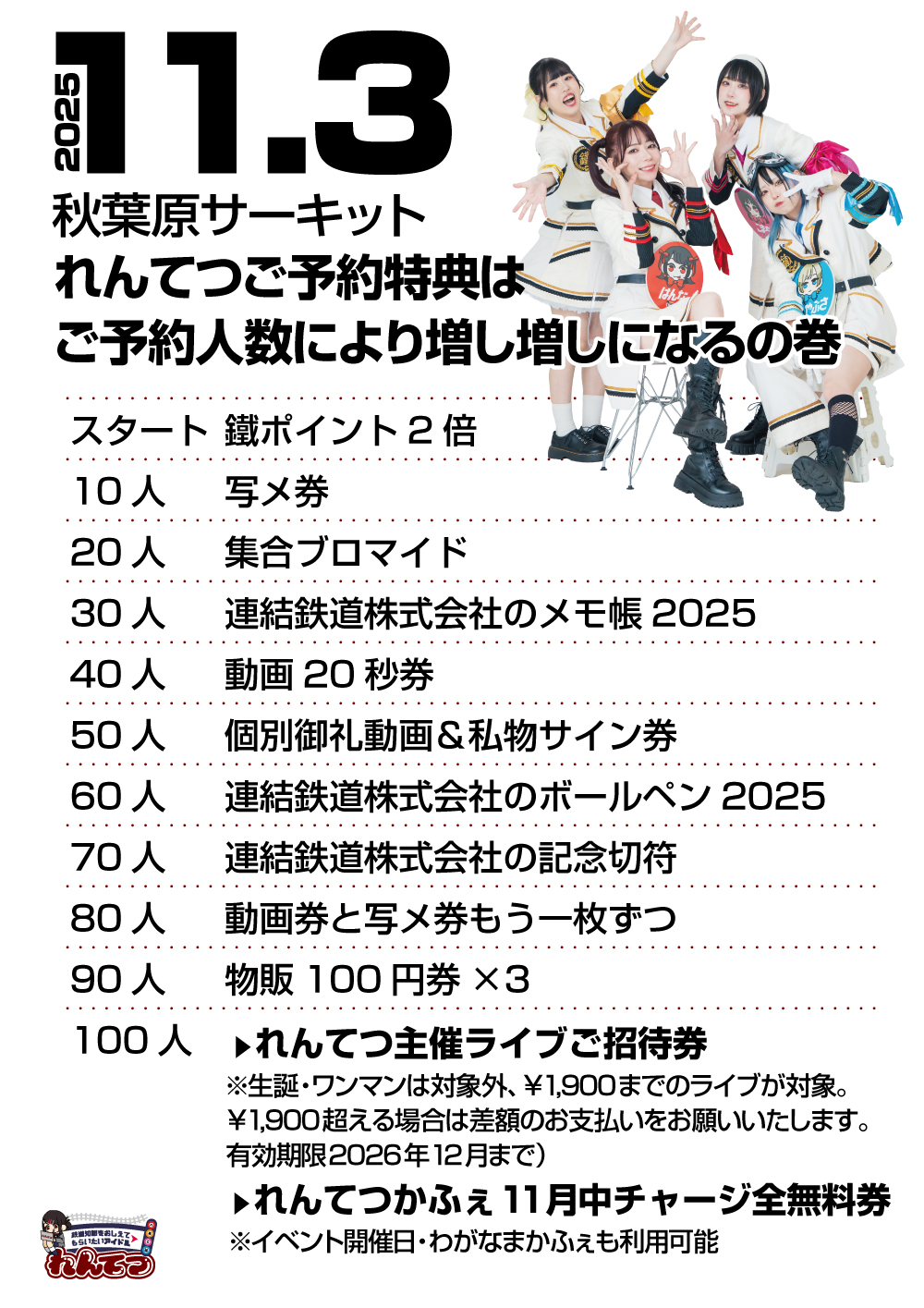 100人 れんてつ主催ライブへ1回ご招待(生誕・ワンマンは対象外、¥1,900までのライブが対象。¥1,900超える場合は差額のお支払いをお願いいたします。有効期限2026年12月まで)れんてつかふぇ11月中チャージ全無料券(イベント開催日・わがなまかふぇも利用可能)