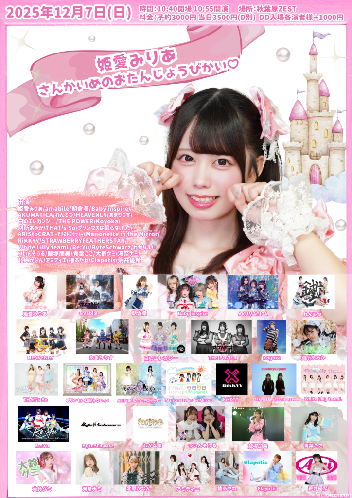 出演者(敬称略) 姫愛みりあ/amabile/朝倉凜/Baby inspire/AKUMATICA/れんてつ/HEAVENLY/あまりりす/白のエレガンシ―/THE POWER/Koyoka/別所あみか/THAT’s So/プリンセスは眠らないっ!/ARIStoCRAT -アリストクラット-/Marionette in the Mirror/RiKKYY/STRAWBERRYFEATHERSTAR/White Lilly teamL/Re:Yu/ByteSchwarz/わがなま/ついんそうる/飯塚朋美/青葉ここ/大鈴グミ/河奈ナミ/北原かなん/アミティエ/椿あやね/Clapotis/荒井優希