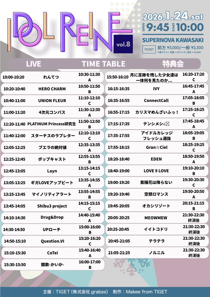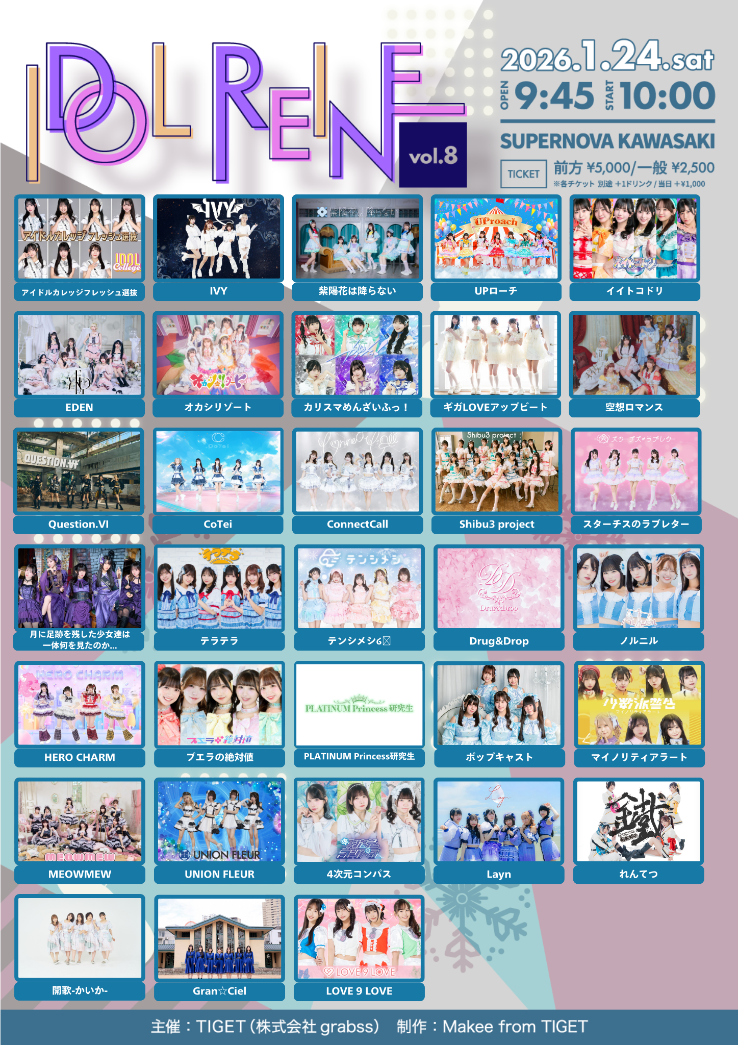 アイドルカレッジフレッシュ選抜/IVY/紫陽花は降らない/UPローチ/イイトコドリ/EDEN/オカシリゾート/カリスマめんざいふっ!/ギガLOVEアップビート/空想ロマンス/Question.VI/CoTei/ConnectCall/Shibu3 project/スターチスのラブレター/月に足跡を残した少女達は一体何を見たのか…/テラテラ/テンシメシ໒꒱/Drug&Drop/ノルニル/HERO CHARM/プエラの絶対値/PLATINUM Princess研究生/ポップキャスト/マイノリティアラート/MEOWMEW/UNION FLEUR/4次元コンパス/Layn/れんてつ