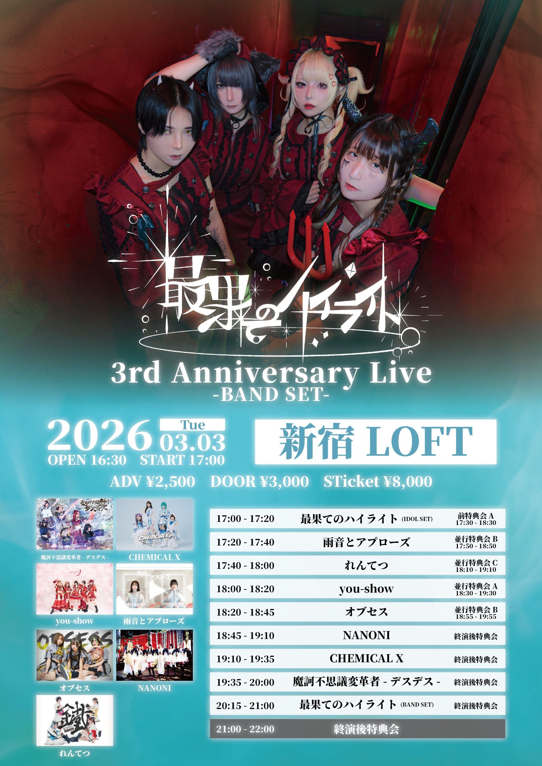 出演者 最果てのハイライト / 魔訶不思議変革者-デスデス- / CHEMICAL X / オブセス / NANONI / you-show / 雨音とアプローズ