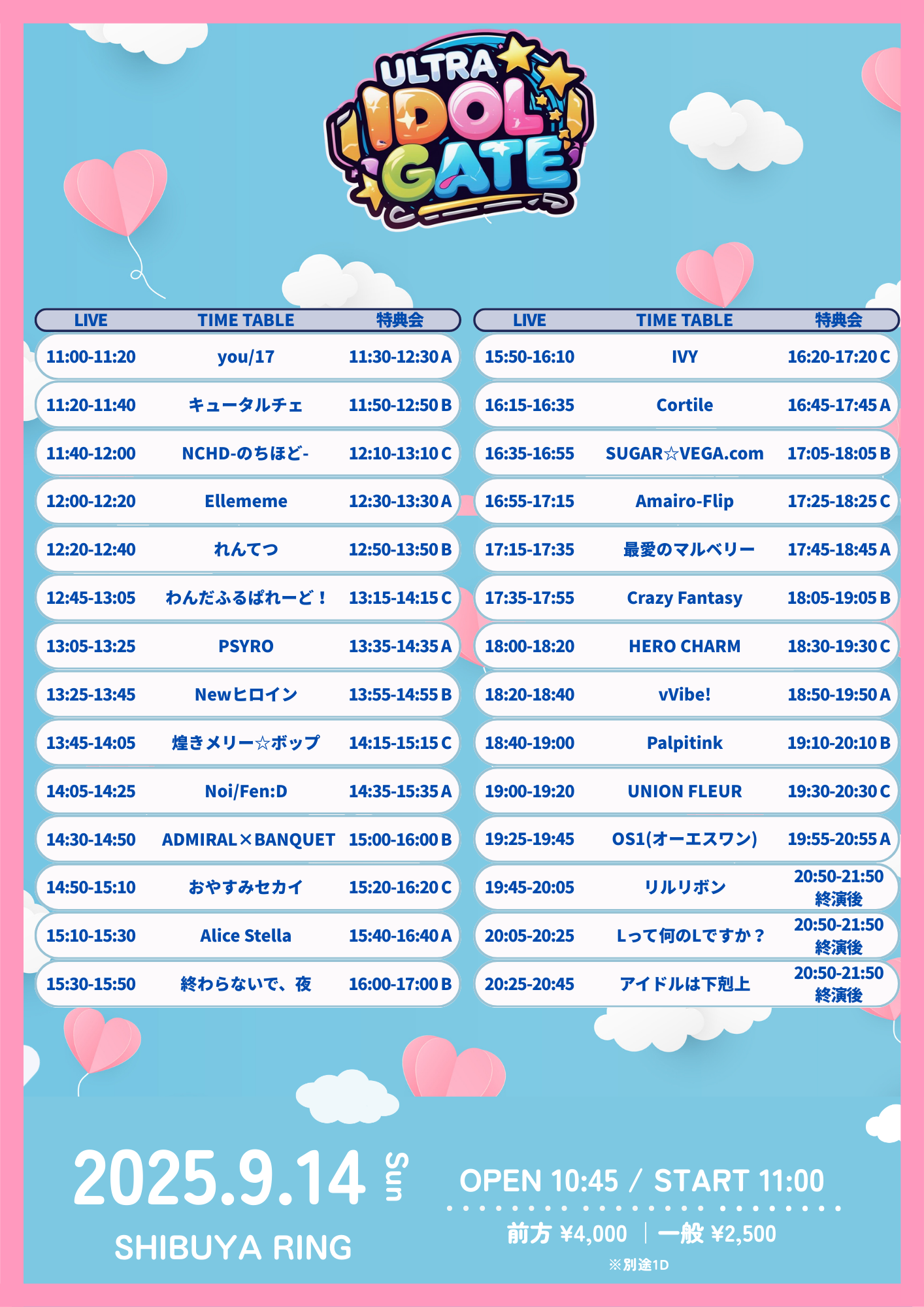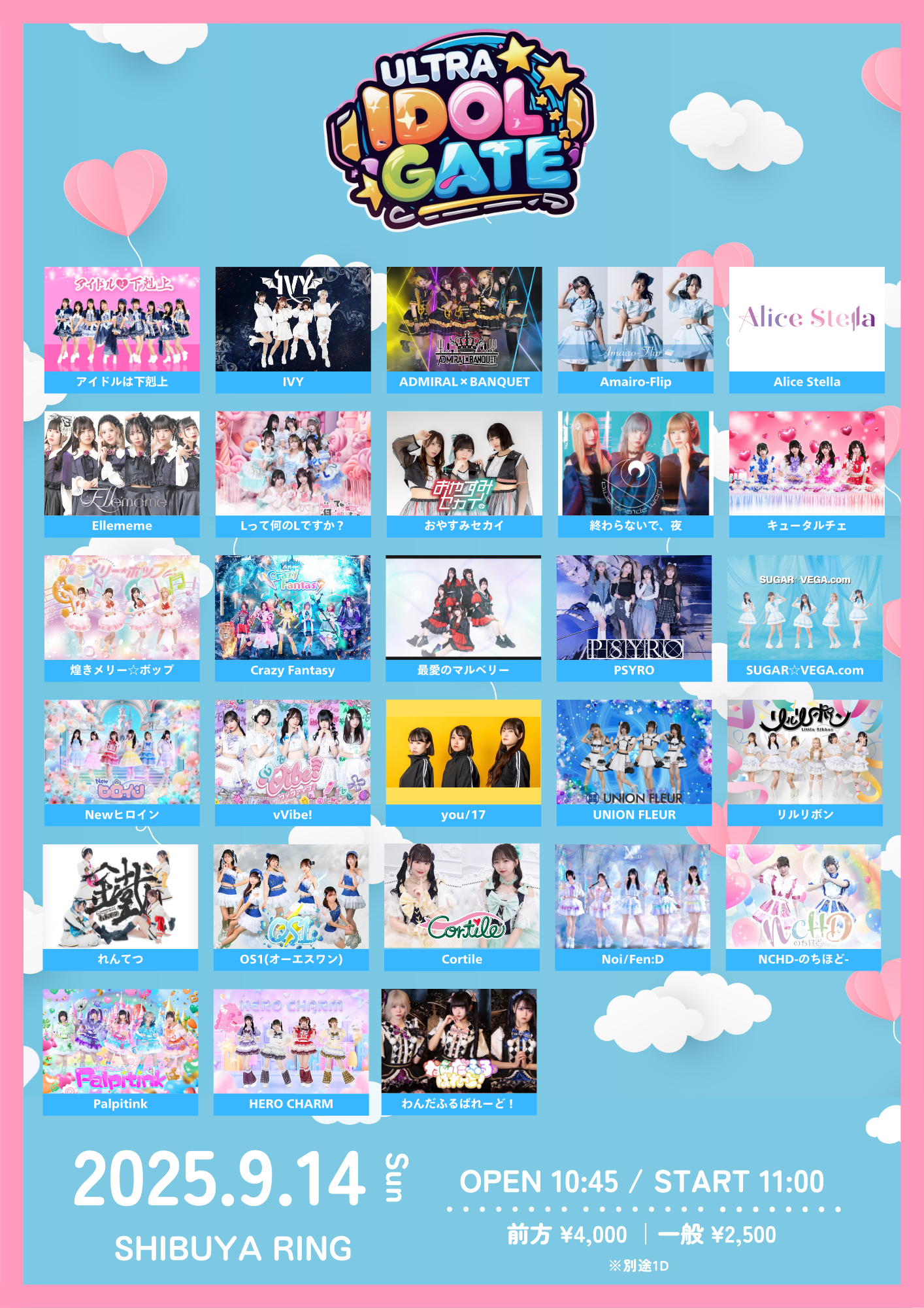 出演者 アイドルは下剋上/IVY/ADMIRAL×BANQUET/Amairo-Flip/Alice Stella/Ellememe/Lって何のLですか?/おやすみセカイ/終わらないで、夜/キュータルチェ/煌きメリー☆ボップ/Crazy Fantasy/最愛のマルベリー/ PSYRO/SUGAR☆VEGA. com/Newヒロイン/vVibe!/you/17/UNION FLEUR/リルリボン/れんてつ